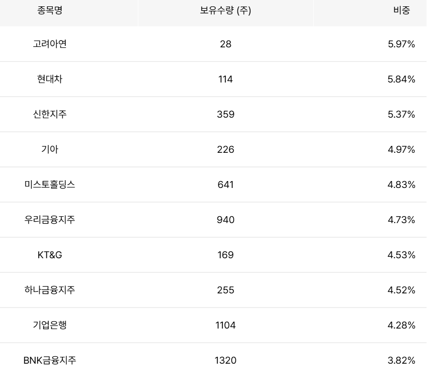 PLUS 자사주 매입 고배당주 ETF는 총 서른 개 기업으로 구성되며, 배당뿐 아니라 자사주 매입 비중이 높은 기업 중심으로 편입되는 것이 특징이다. 구성 종목은 총 서른 개 기업으로 이루어져 있으며, 단순히 배당이 높은 기업이 아니라, 배당 정책과 자사주 정책을 동시에 강화해 온 기업들로 이루어져 있어 안정성과 성장성을 함께 추구할 수 있다.