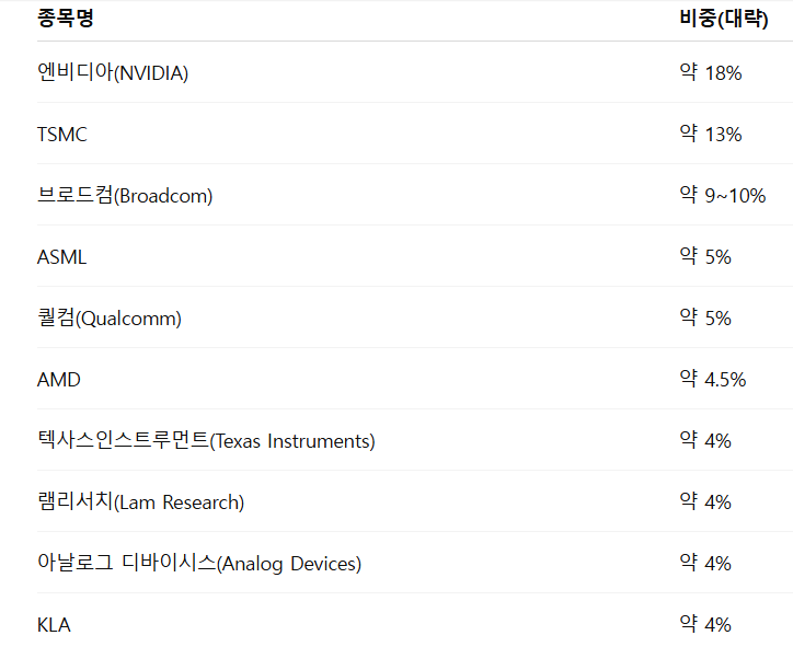 동일 지수를 추종하는 SMH보다도 저렴한 수준으로, 장기 투자 시 비용 절감 효과가 수익률에 긍정적인 영향을 줄 수 있습니다.