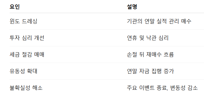 이 때문에 연말 실적이 좋았던 주식·대형주를 매수하고 부진한 포트폴리오를 정리하는 흐름이 강해집니다.